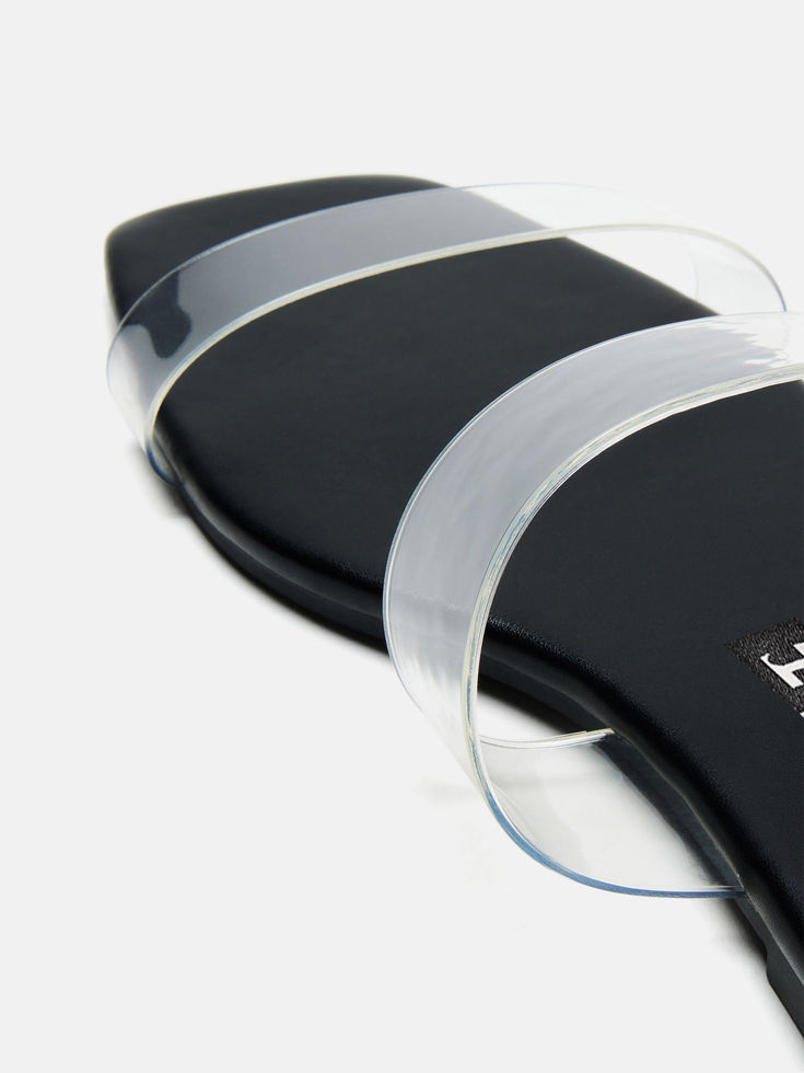 Elevate your everyday style with the IRUSSH Mumbai Nights Flats. These chic black slides feature dual transparent straps, creating a barely-there look that elongates your legs and adds a touch of modern elegance. The comfortable flat sole ensures all-day wear, making them perfect for a day out or a quick errand. These versatile slides effortlessly complement any outfit, rain or shine.