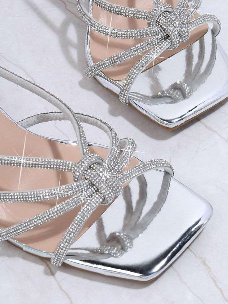 Dazzle in these glamorous silver rhinestone block heel sandals. Featuring a trendy square toe and a comfortable block heel, these sandals offer both style and stability. The delicate rhinestone straps create a sparkling, eye-catching design, perfect for parties, weddings, or any special occasion. The adjustable ankle strap ensures a secure fit. Shop now for women's sandals, silver heels, rhinestone sandals, block heels, square toe heels, and party shoes. Elevate your evening look with these stunning silver heels.